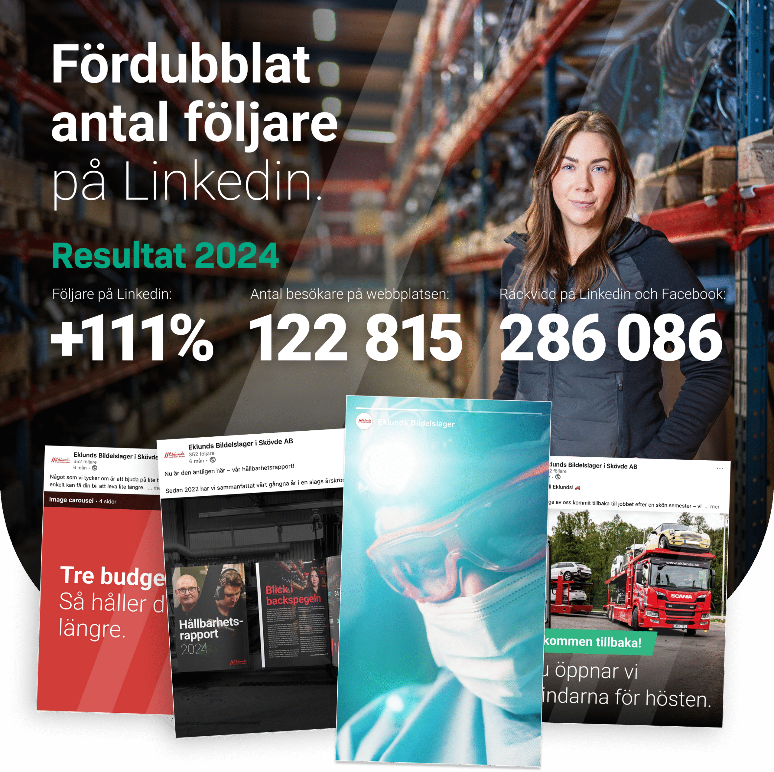 Eklunds Bildelslager startade sin verksamhet 1948. De har med stor beslutsamhet och framsynthet utvecklat verksamheten från dåtidens bilskrot till en modern och hållbar anläggning för bildelsåtervinning. Företaget deltar kontinuerligt i utvecklingsprojekt för att utveckla sin hållbarhet i allt från att demontera bildelar, som får nytt liv i ett nytt fordon, till en attraktiv arbetsplats som både vilar på finansiellt stabil grund och är lockande och engagerande för medarbetare!